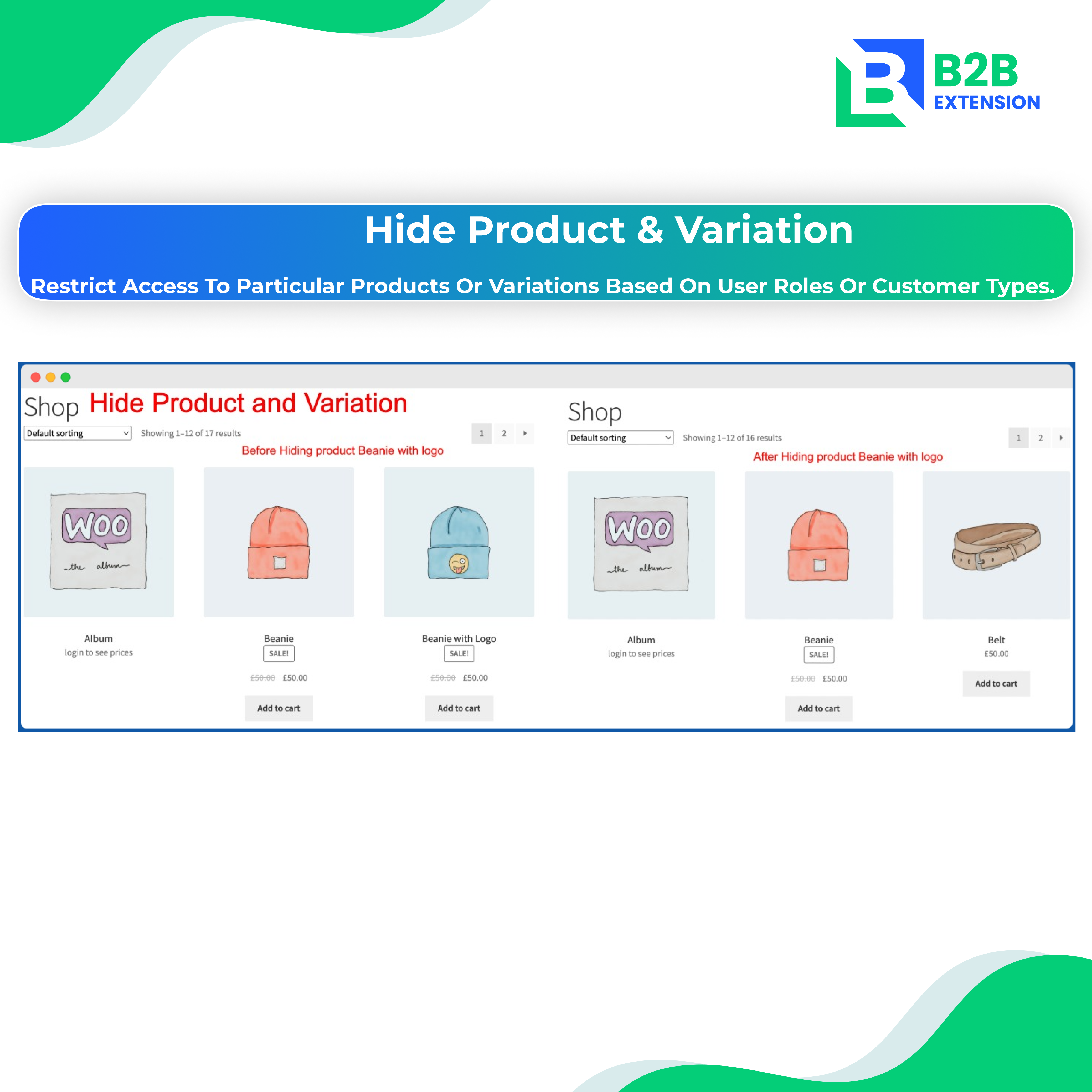 - Rule-Based Product Visibility: Define rules to hide products or variations based on specific criteria.